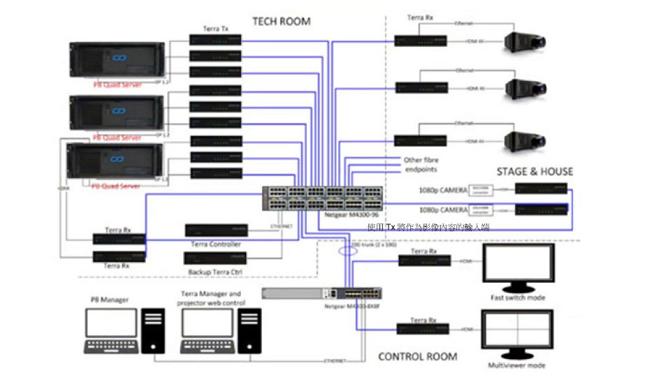 劇院後臺設備間與控制室將透過一個20G的光纖連接NETGEAR M4300-96X 與 M4300-8X8F 所組的10G網路,讓控制室內的技術人員也可以即時觀看。