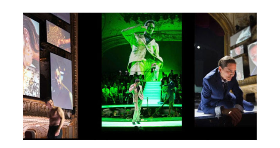 投影機所投射的影像橫跨劇場,從包廂走廊將影像畫面投射到對面的布幕之上。不同的螢幕展現了由攝影機捕捉到的多角度即時畫面,以及投影機所呈現的影像內容