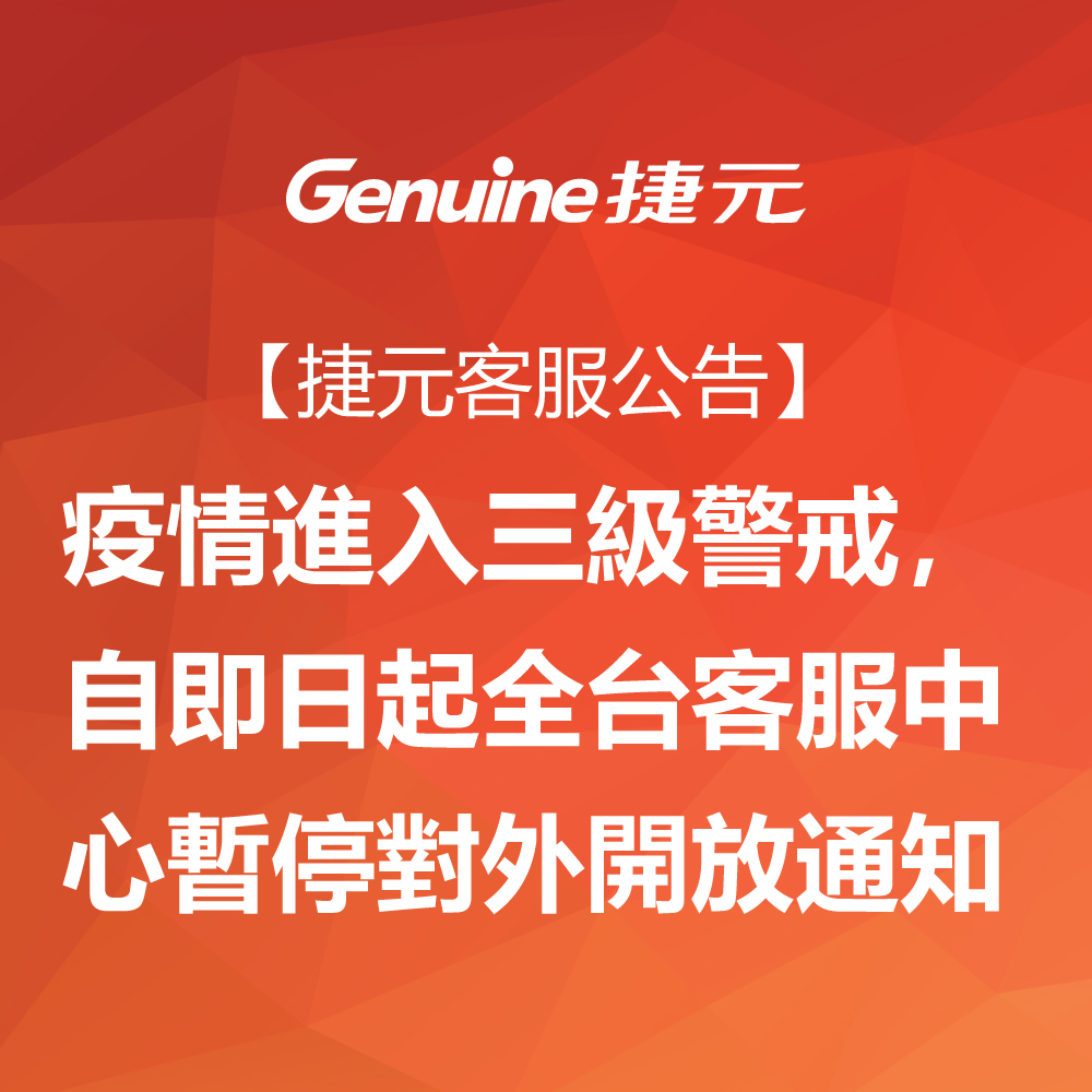 各位親愛的客戶,您好 依據中央流行疫情指揮中心昨(15)日公布臺北市及新北市,提升至COVID-19疫情警戒標準第三級,全國則為第二級。 國內產業及企業營運已陸續受到COVID-19疫情影響,層面包括人員出勤、業務推展及生產營運等。 為了降低疫情對企業營運的衝擊,指揮中心要求各企業落實「企業因應嚴重特殊傳染性肺炎(COVID-19)疫情持續營運指引」。 本公司為了因應政府的防疫措施,決策自即日起提升警戒,並調整內部員工之出勤規範,因此全台各地客戶服務中心, 將自5/17(一)開始暫停對外開放。這段期間勢必會衝擊影響到商品之相關售後服務,懇請各位客戶諒解, 在防疫的過程大家能共體時艱,一起為台灣防疫盡一份心力, 讓我們一起攜手共度難關,感謝您的支持與配合。 影響範圍說明如下: 1. 客戶親送維修品,改為免費到府收送服務。 2. 暫停到府維修機制,改為免費到府收送服務。 3. 有任何問題諮詢,都將會採取先留電話後續回電之方式服務。 捷元客服(Genuine Care) 全台售後服務據點 技術諮詢專線: 02-6605-0550 分機550 台北總公司 070-1016-6677 (網路電話) 臺北市內湖區瑞光路66巷36號 新竹 03-6682555 #2500 新竹縣竹北市嘉祥五路29號2樓 台中 04-23139955 #3500 臺中市西屯區惠來路三段206之一巷31號 台南 06-2425588 #5500 臺南市永康區蔦松二街18號 宜蘭 03-9605001 宜蘭縣羅東鎮光榮路342-1號2樓 花蓮 03-8562990 花蓮縣吉安鄉自立路2段78號 高雄 07-5503770 #6500 高雄市鼓山區中華一路352號14樓 歡迎加入捷元line@ 連結 : https://line.me/R/ti/p/@genuine_500